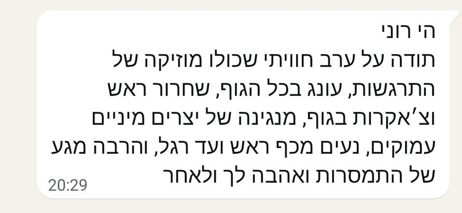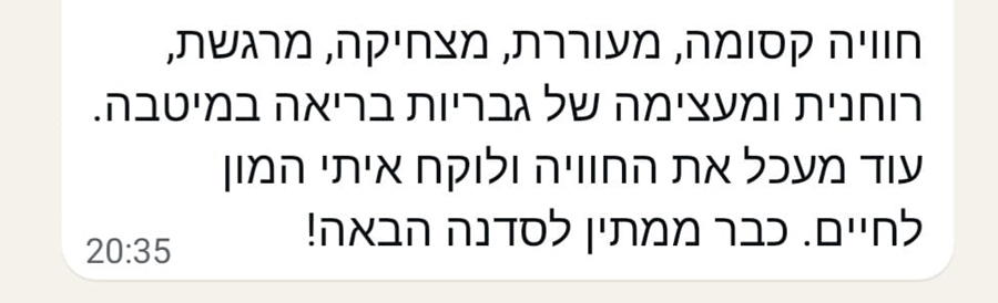 הצלחתי להתמסר יותר תוך כדי תקשורת וכמובן שהמרחב והתוכן שיצרת איפשר את זה עידן מאוד נהנה ואיזה מקסים שהוא שיתף פעולה בפתיחות . שמחתי מאוד שהוא נחסף לזה בגיל צעיר ושזה יתן לו כלים בתוך המירוץ של תא כפי שהוא אמר. סופש נפלא